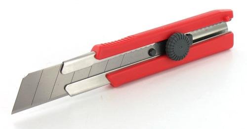 #Bizline 700069 : Cutter grand modèle.Caractéristiques : Poignée en élastomère, guide-lame en inox et lame en acier SK2. Largeur de lame 25 mm, épaisseur 0,7 mm, fractionnable en 6 parties. Equipé d'une vis de blocage et déblocage de la lame. Poids 120 g.